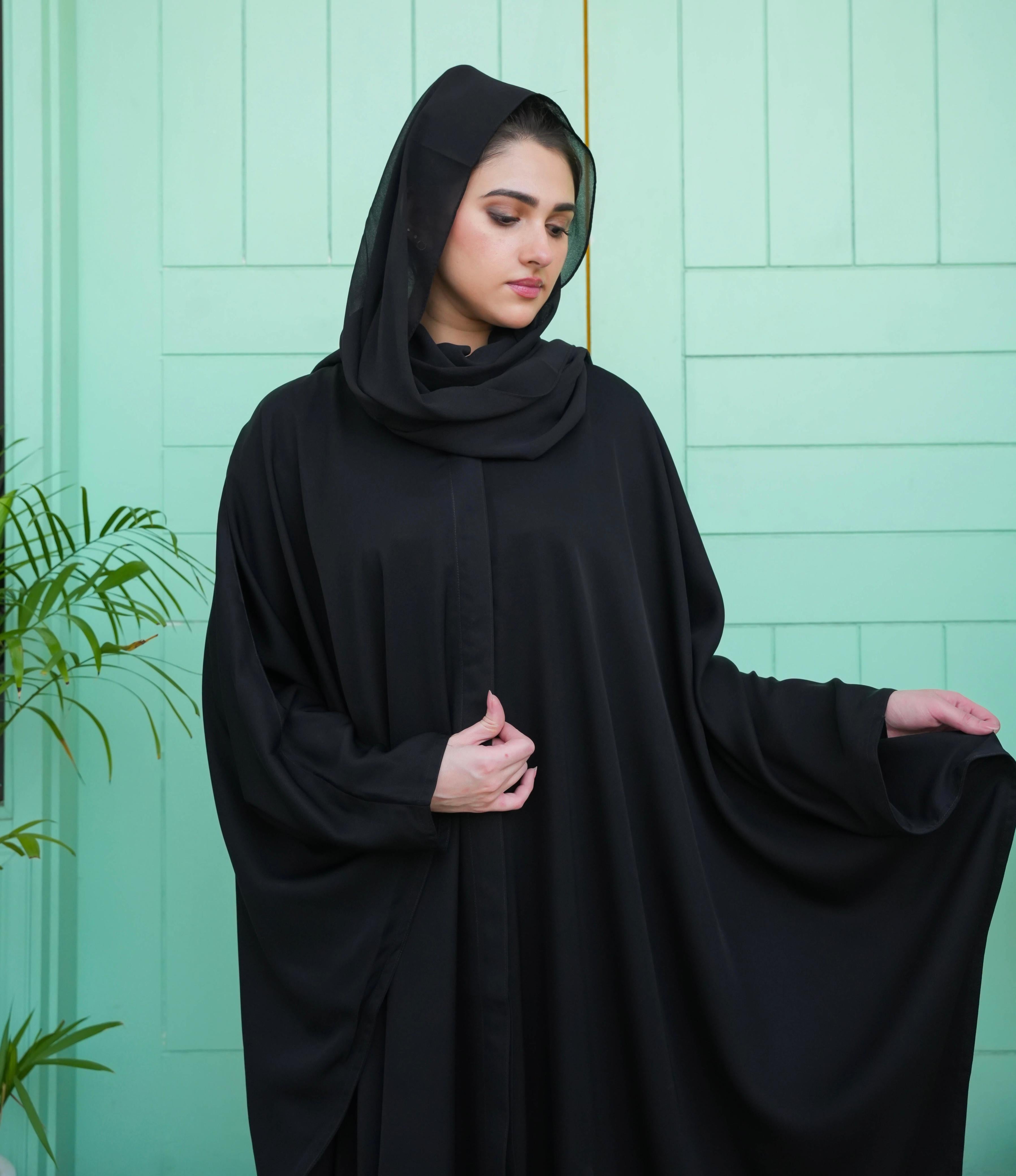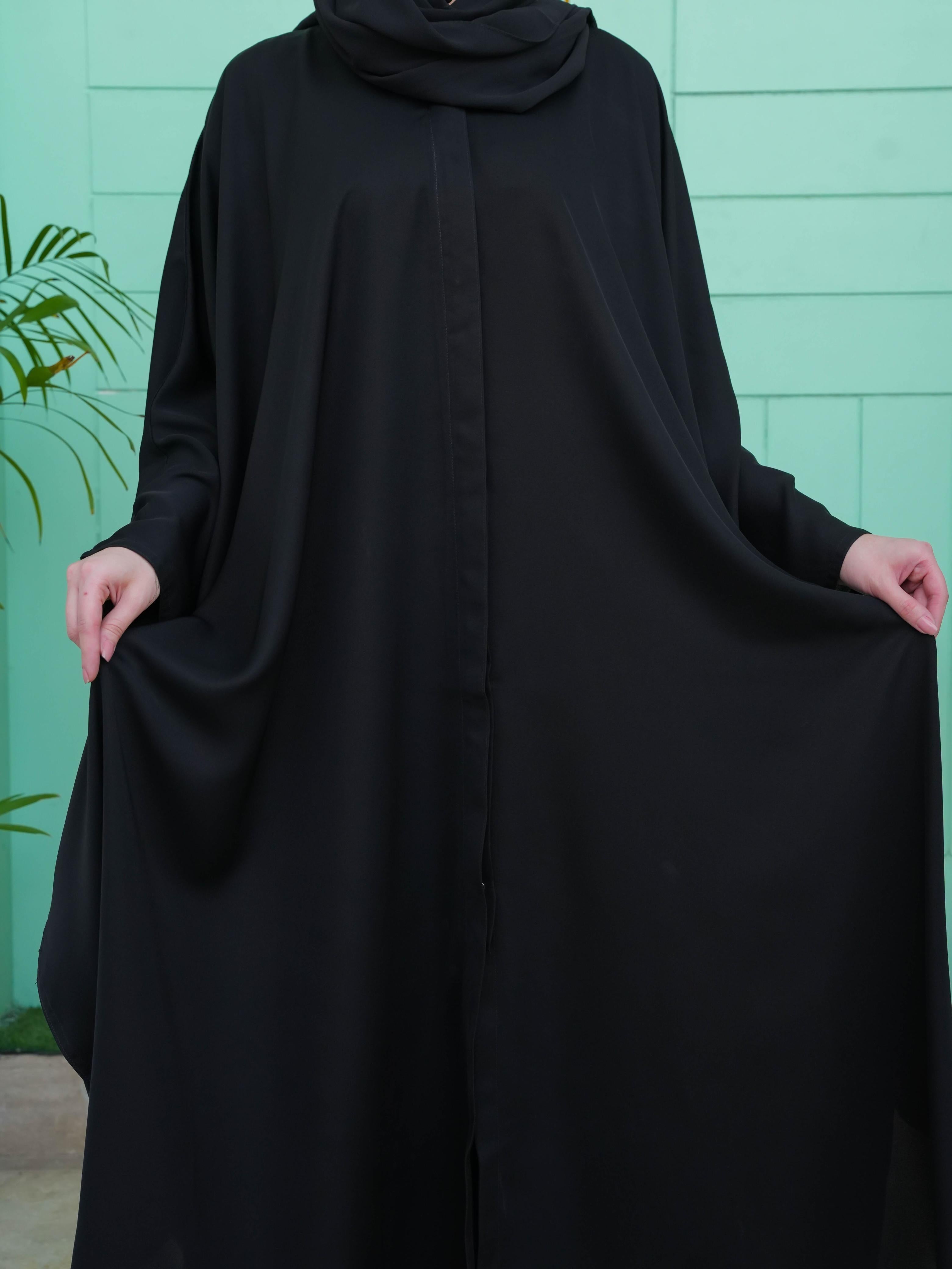 A V-neck, buttoned down Butterfly Cut Abaya. Its butterfly cut design and full baggy style ensures comfort and modesty. Wearing this abaya is effortless and stylish.