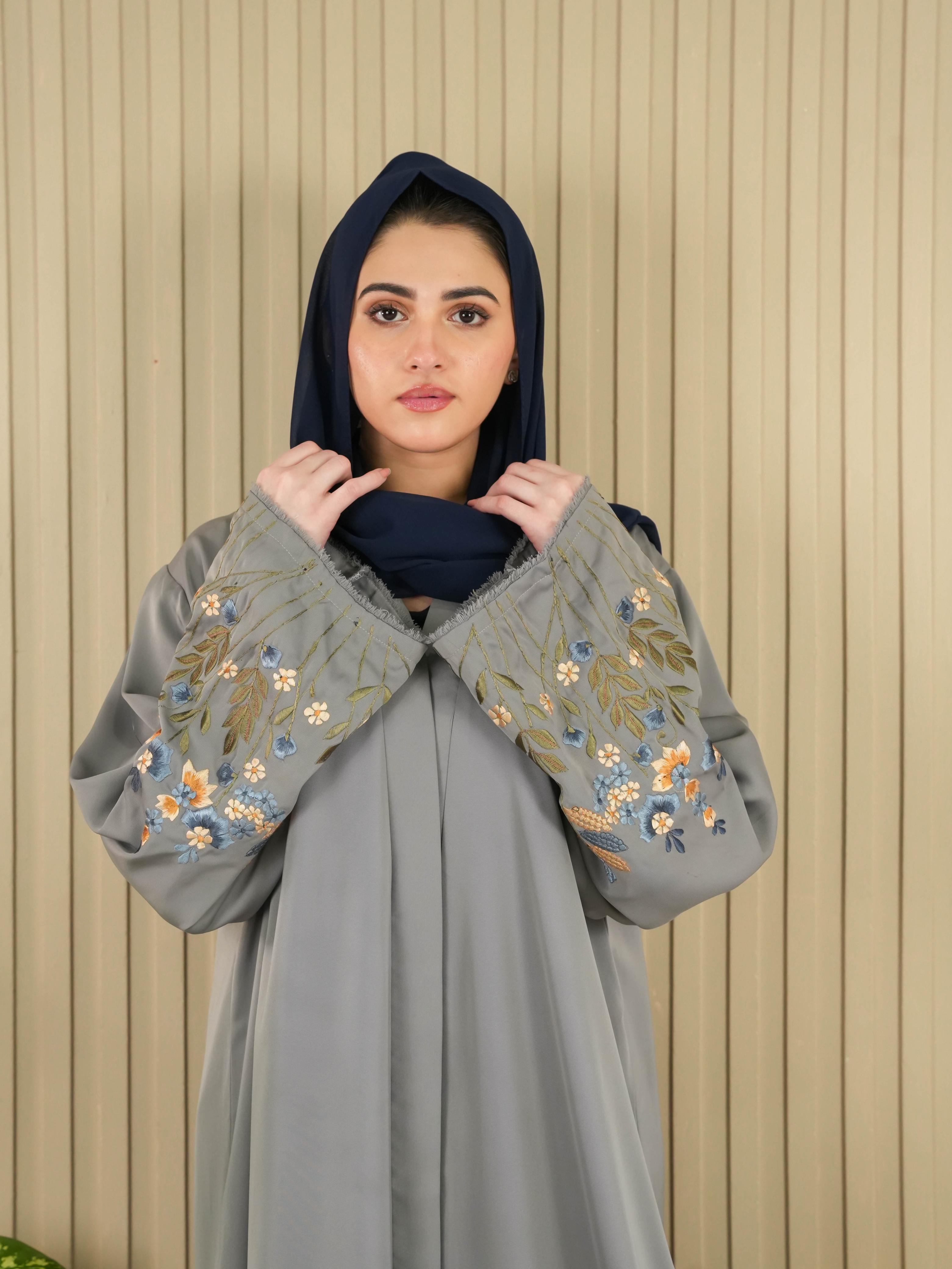 Our Front Open Abaya, adorned with exquisite flower embroidery on sleeve ends. Its a V- neckline with button through front opening.