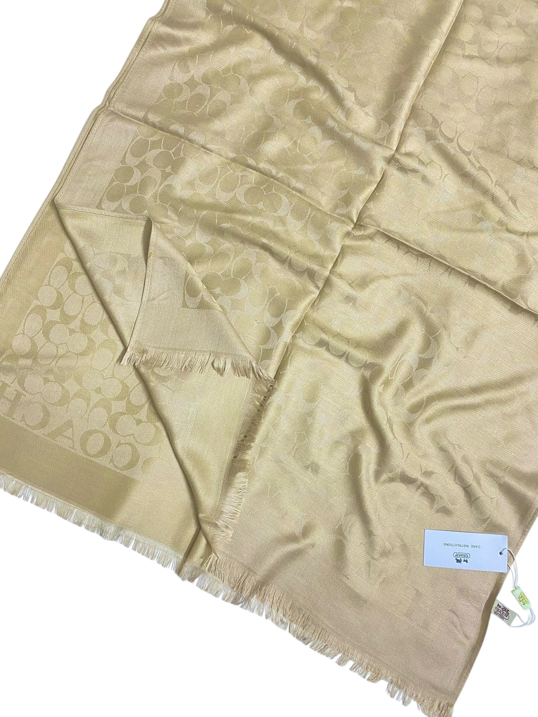 Dull gold branded jacquard hijab with subtle woven pattern. Dull gold branded jacquard hijab with subtle woven pattern.