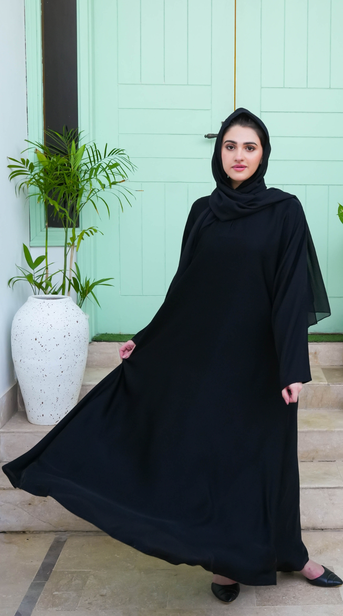 Style Round neck, Front closure with 70 inches flaired daman (maxi abaya)