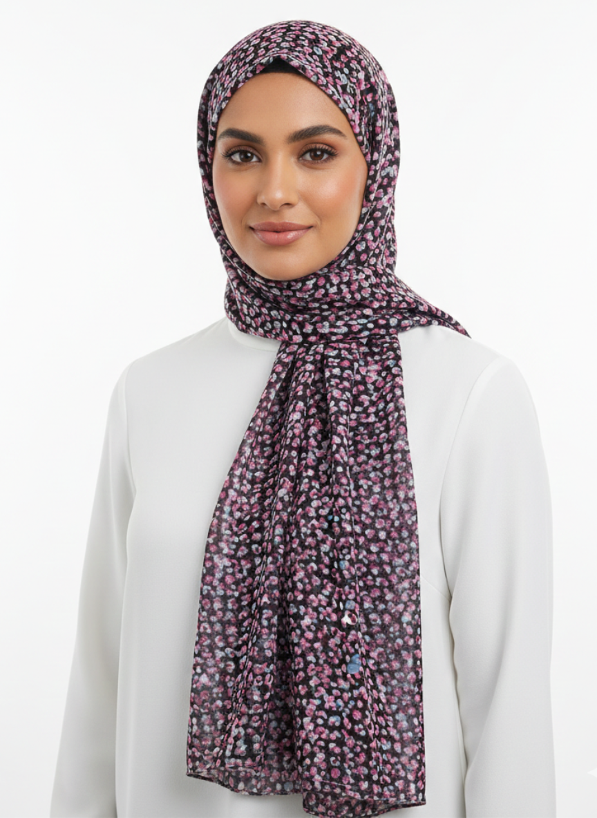 A close-up of a Premium Printed Hijab with a delicate floral pattern in shades of pink and green. A close-up of a Premium Printed Hijab with a delicate floral pattern in shades of pink and green.