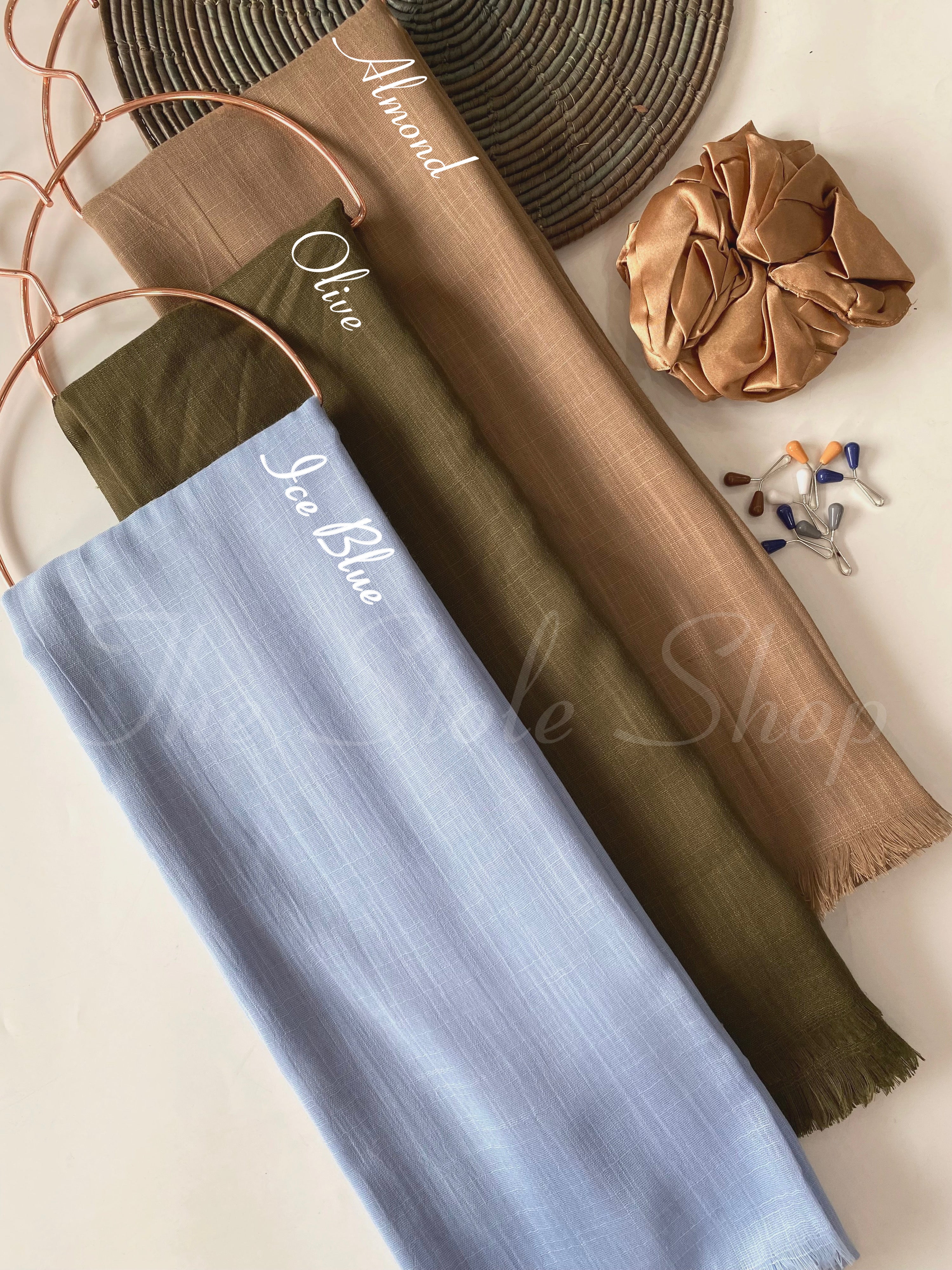 Premium Turkish Self Textured Hijab Bundles with a scrunchie and a pack of 6 grippers.