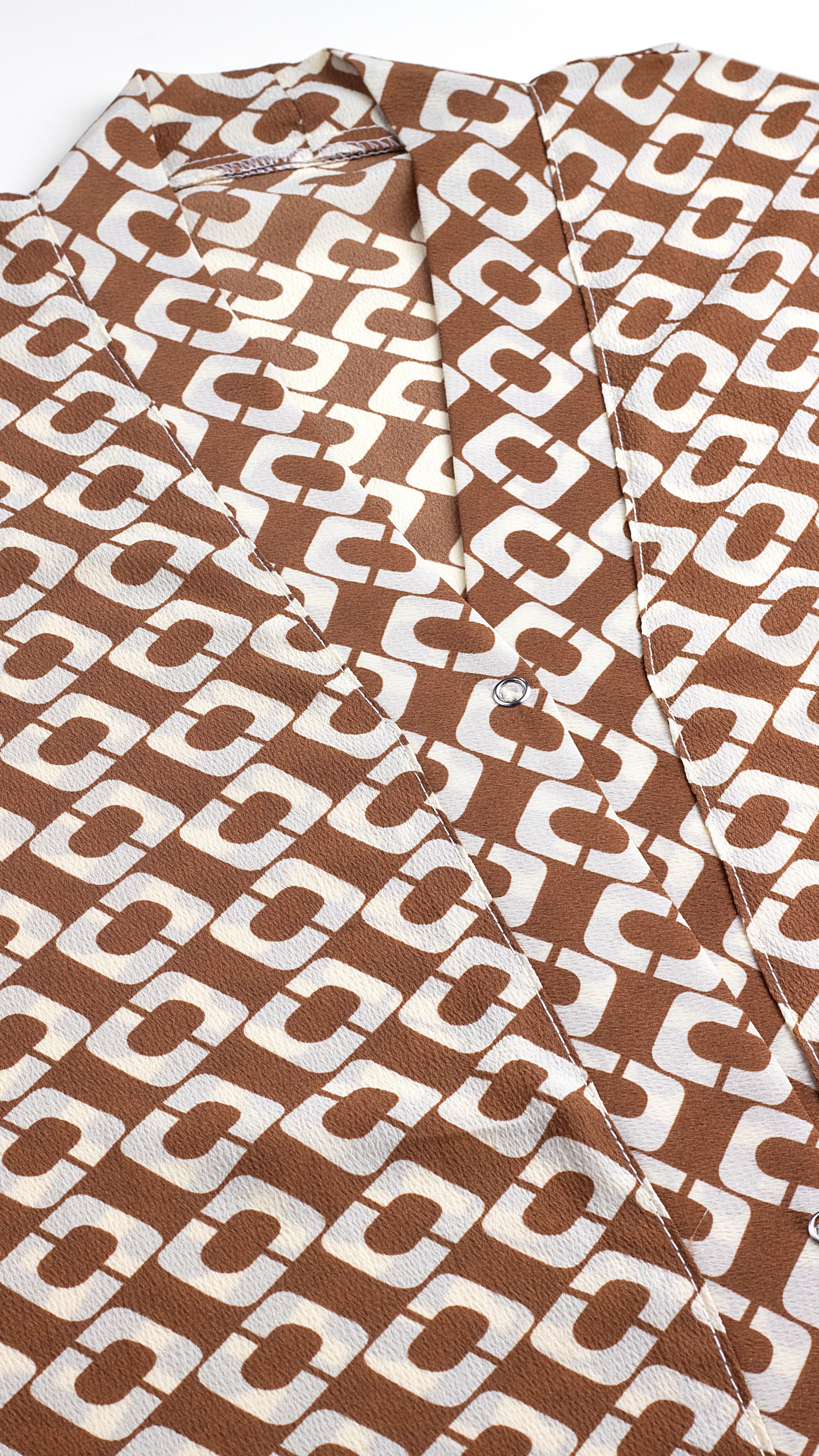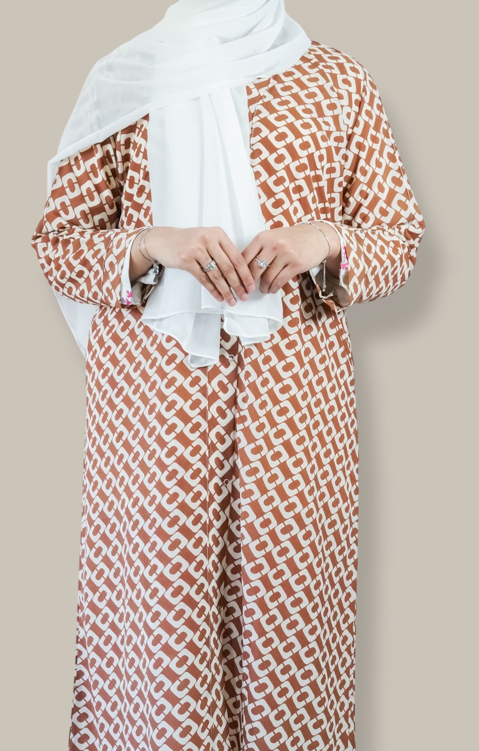 An elegant front-open abaya designed with a sleek straight cut, a flattering V-neckline, a stylish button-down closure, and adorned with a chic printed pattern.
