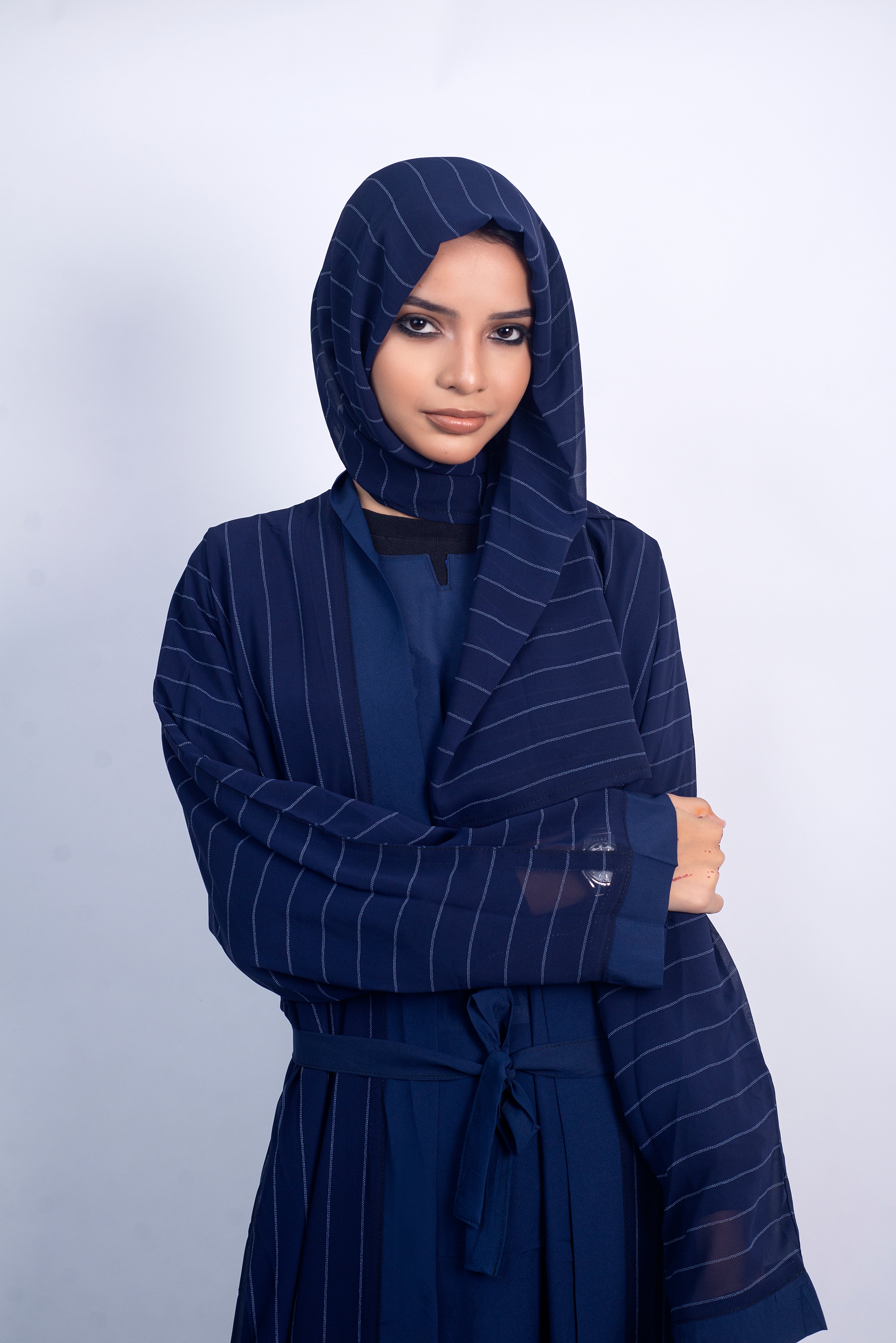 Full length, flowy chiffon abaya set with open front. Navy Blue Inner is not attached and elastic sleeves (inner) for a comfy fit. Hijab & waist belt is also included.