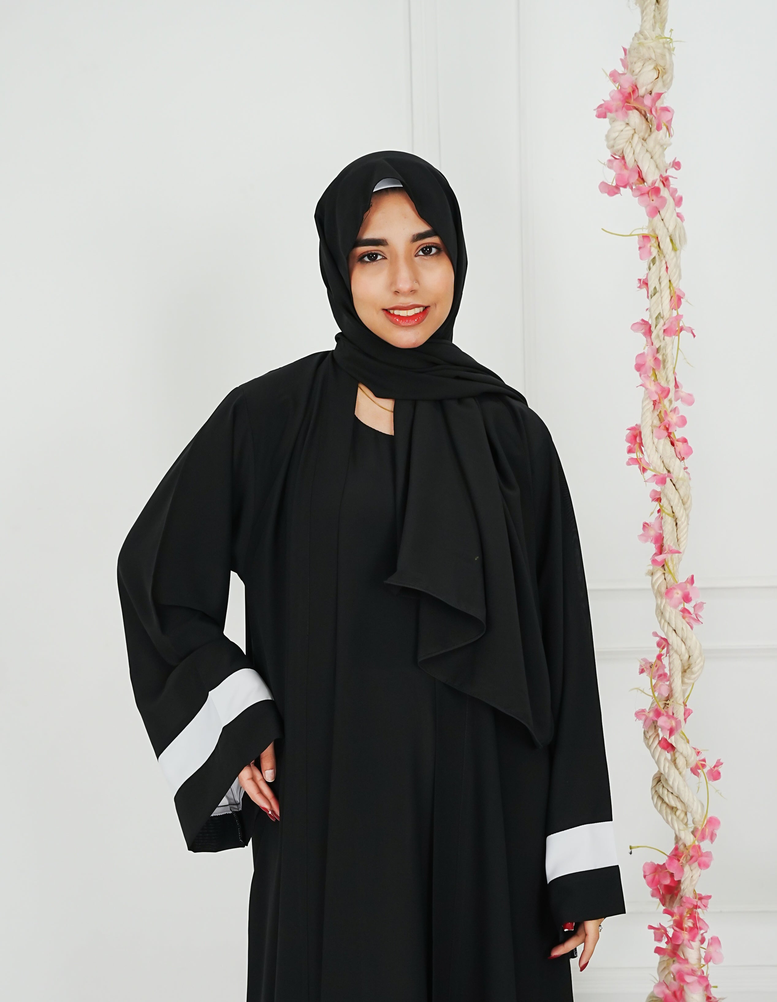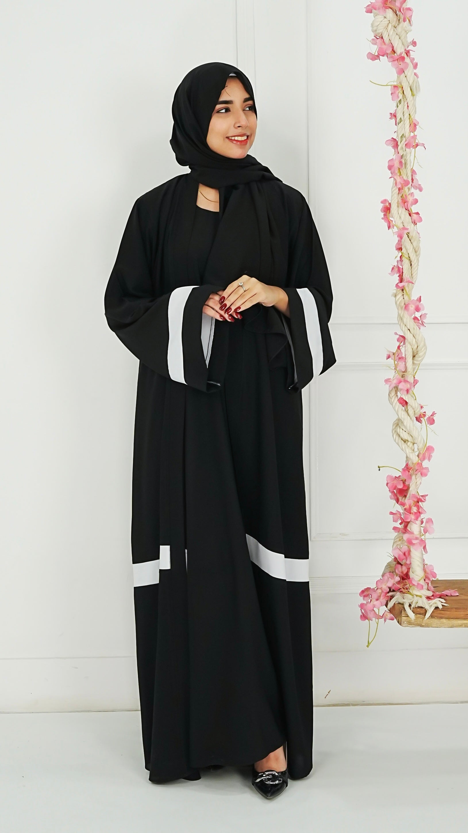 Full length, front open abaya set in soft drapey chiffon fabric. Inner is attached. Hijab & Waist belt is also included.